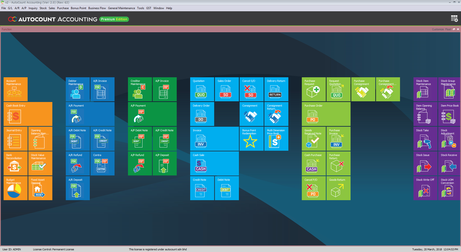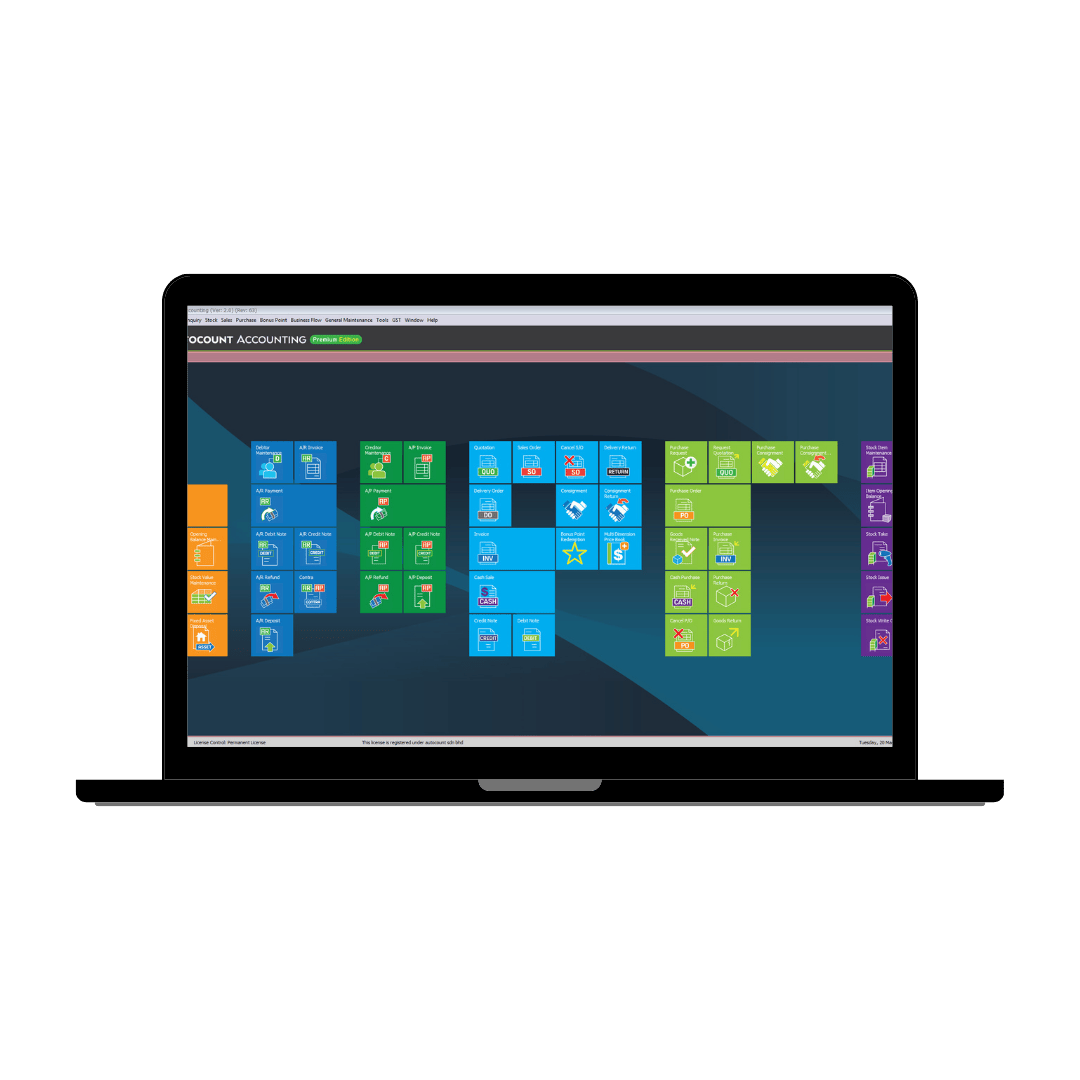 | OPTIONAL MODULE Intelligent Costing Advanced Multi-Currency API Bonus Point Consolidated Financial Report Department Export Account Export Stock Filter by Account Import Third Party XML Multi-Dimensional Price Book Multi-Level Assembly Serial Number Stock Disassembly Unrealized Gain/Loss Sales Order Processing Assembly Order Processing | POS COUNTER POS A POS B POS Branch POS MODULES POS Serial Number POS Item Batch POS Item Package |